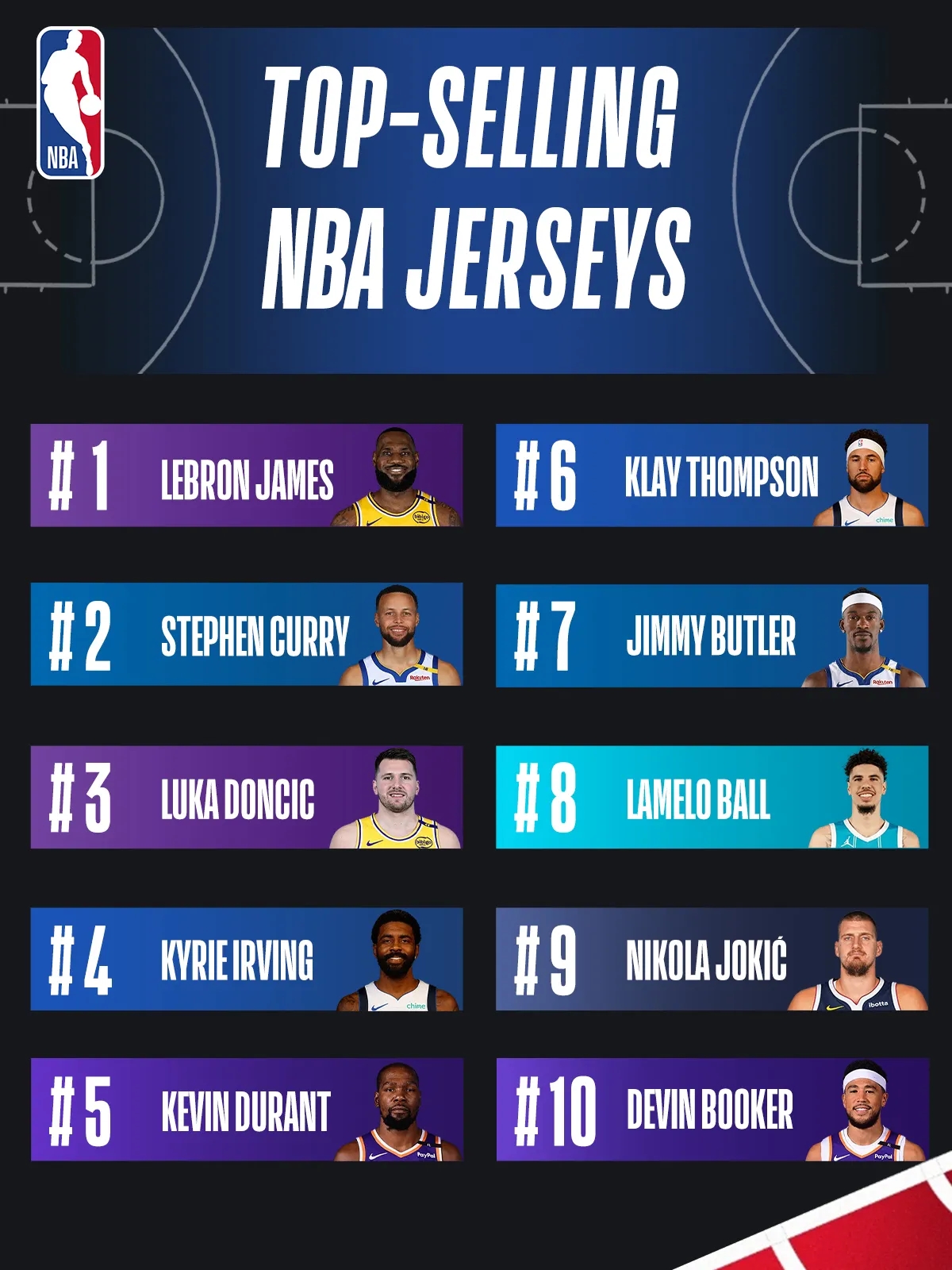 詹姆斯个人球衣排名第一,紧随其后的则是库里以及东契奇,欧文和杜兰特分列四五位,三球力压约基奇排名第八。